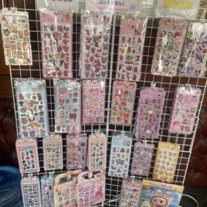 店頭に、子どもから大人まで楽しめるかわいいシールを多数ご用意しています。キャラクター風のデザインやキラキラしたシール、ぷっくりとした立体タイプのシールなど、見ているだけでも楽しくなるラインナップです。